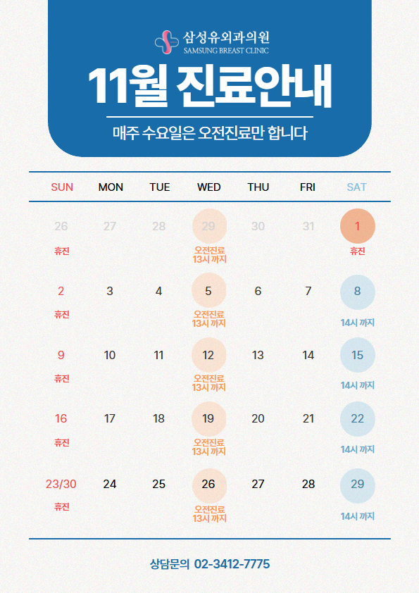 안녕하세요, 삼성유외과 2025년 11월 진료시간 안내입니다.