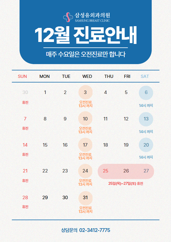 페이지 정보 작성자 최고관리자 댓글 0건 조회 66회 작성일 25-11-27 18:19 목록 본문 안녕하세요, 삼성유외과 2025년 12월 진료시간 안내입니다.내원시 참고하시기를 당부드립니다.정확하고 세심한 진료로써 최선을 다하겠습니다. 감사합니다. 다음글삼성유외과 2025년 11월 진료시간 안내입니다. 25.11.04