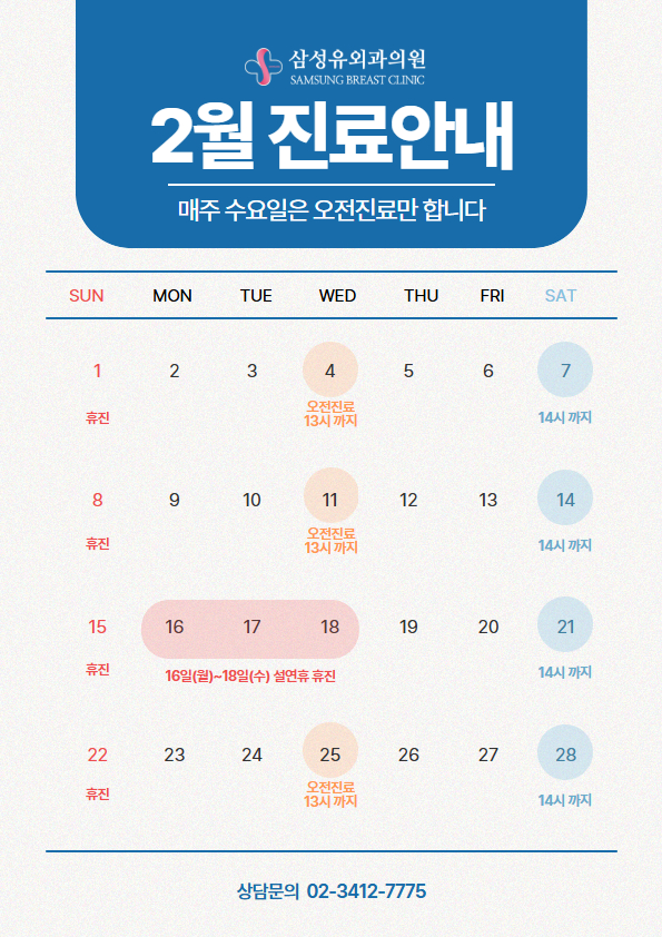 페이지 정보 작성자 최고관리자 댓글 0건 조회 13회 작성일 26-01-30 08:47 목록 본문 안녕하세요, 삼성유외과 2026년 02월 진료시간 안내입니다.내원시 참고하시기를 당부드립니다.정확하고 세심한 진료로써 최선을 다하겠습니다. 감사합니다. 다음글삼성유외과 2026년 01월 진료시간 안내입니다. 25.12.27