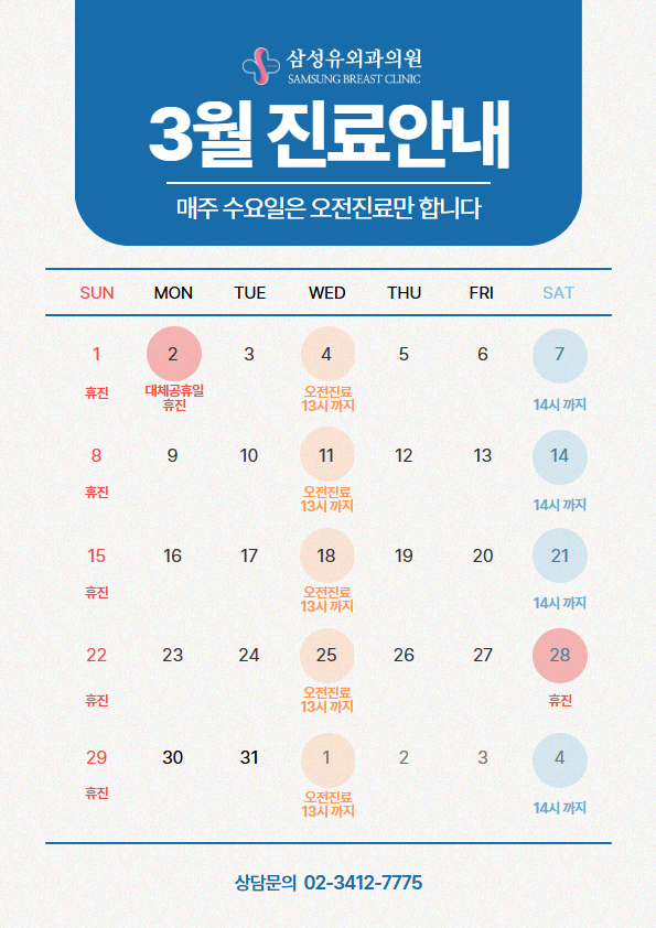 안녕하세요, 삼성유외과 2026년 03월 진료시간 안내입니다.