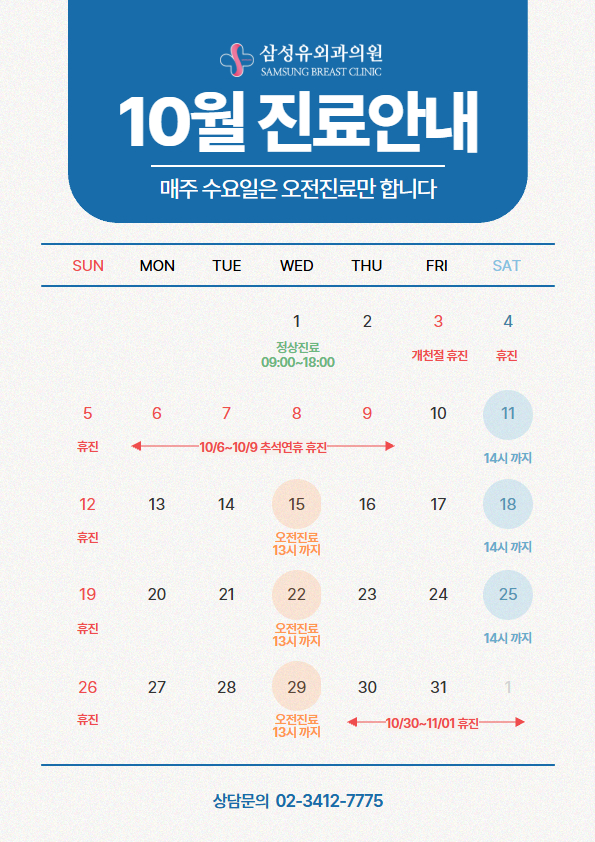 페이지 정보 작성자 최고관리자 댓글 0건 조회 81회 작성일 25-09-24 10:18 목록 본문 안녕하세요, 삼성유외과 2025년 10월 진료시간 안내입니다.내원시 참고하시기를 당부드립니다.정확하고 세심한 진료로써 최선을 다하겠습니다. 감사합니다. 다음글삼성유외과 2025년 9월 진료시간 안내입니다. 25.08.28